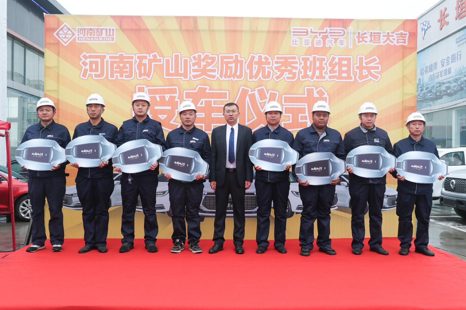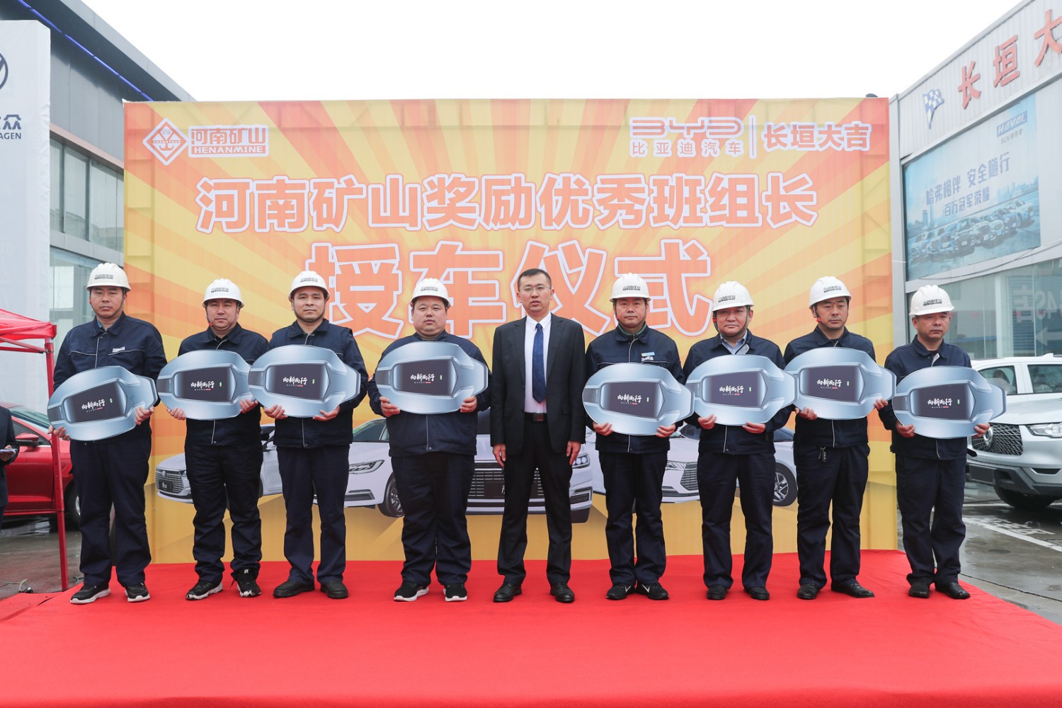 3月11日,河南礦山獎(jiǎng)勵(lì)**班組長授車儀式在長垣大地亞飛汽車城內(nèi)隆重舉行。公司24名一線**員工得以重獎(jiǎng),每人獲得一輛純電動(dòng)比亞迪全新秦EV。據(jù)悉,該批車市場總價(jià)值420余萬元。